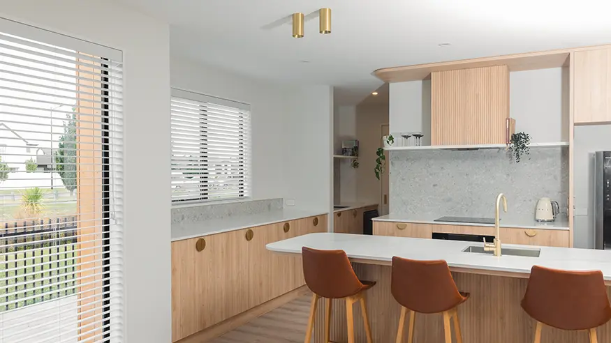 But their most recent passion project was their own new family home. The two‑storey, light‑filled modern build overlooks a park in a new Christchurch subdivision and combines family living with a stylish aesthetic.