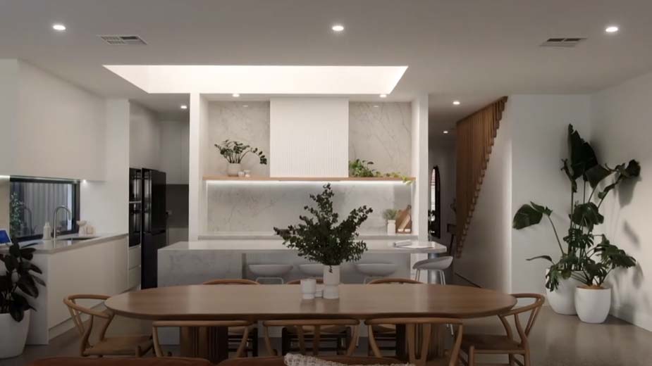 This large two-storey duplex in coastal Adelaide is a family home for Lucas and Krystle of Elmac Homes and their four children, and also doubles as a display house for their residential building business. Sitting on a narrow 368m2 site, the home is light and airy thanks to clever use of natural light and a calming interior colour palette.