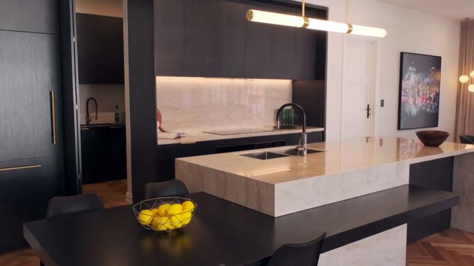 From the outside, the home has the traditional hallmarks of a stone exterior, decorative portico and lacework embellishments. Inside, a dark timber kitchen and stylish living area bring a modern feel to the space.