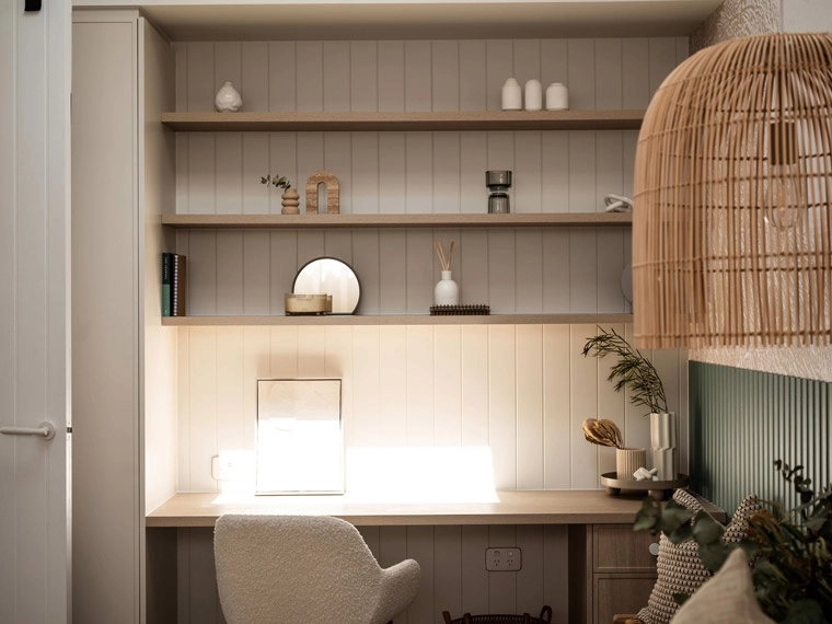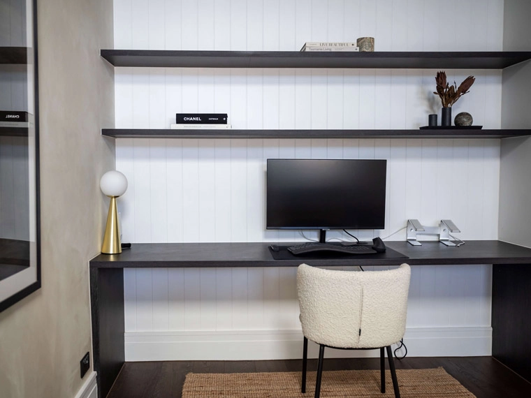 - Is there enough natural light or will you need extra LED downlights, task lighting for desk work, or a ring light for video calls? You could also install dimmers for adjusting the light intensity as needed.