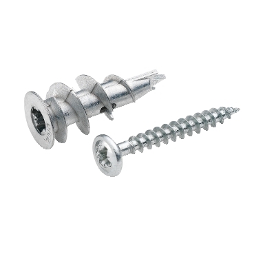 Cavity fixing IMT37414 (set of 5 pieces) is designed for lightweight installations in plasterboard, including wood screw (length: 35 mm, diameter 4.5 mm) with cross-slot Pozidriv 2 Material: Zinc. Electroplated steel screw Installation: Screw the TPD cavity fixing into the plasterboard. Mount the fixture by screwing the screw into the TPD Installation: Screw the TPD cavity fixing into the plasterboard. Mount the fixture by screwing the screw into the TPD