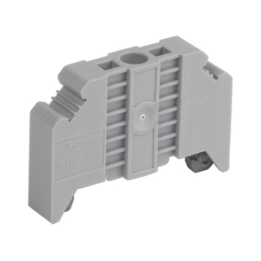 Linergy NSYTR end stop for terminal block. It is compatible with TRV screw terminal, TRH IDC, TRP push-in and TRR spring terminal block. It has grey surface treatment. Mounting by screws. Sold in lots of 50 units.
