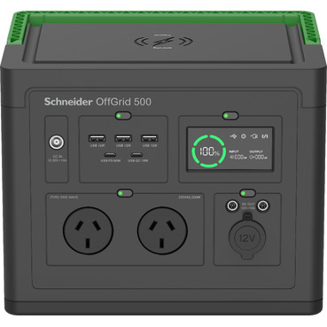 Schneider OffGrid Portable Power Station 500 230V, 517Wh Lithium-ion, LCD, 2 AS3112 Australian outlets, Sinewave, 3 USB-A, 2 USB-C, Wireless Charger