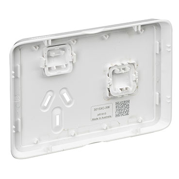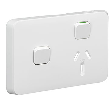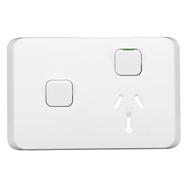 This Clipsal Iconic Single Power Point Skin is horizontally mounted, has an extra switch and is available in a standard white or subtle colour variants. It offers a choice of edges; solid vivid white or translucent edges that meld with its surroundings.