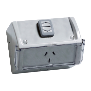 Weathershield Single Switch Socket Outlet 250V, 15A, Weather Proof, Flap | Chemical Resistant Grey
