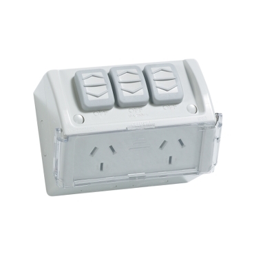 Weathershield Twin Switch Socket Outlet 250V, 10A, Weather Proof, Flap, Extra Switch | Chemical Resistant Grey