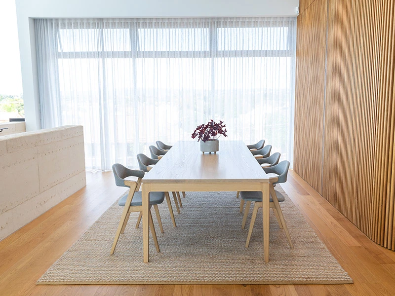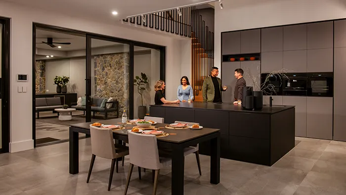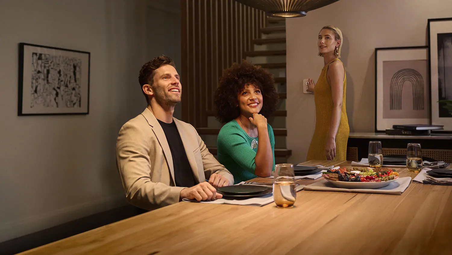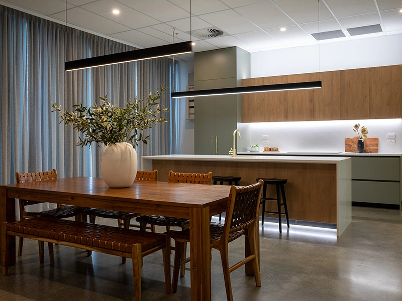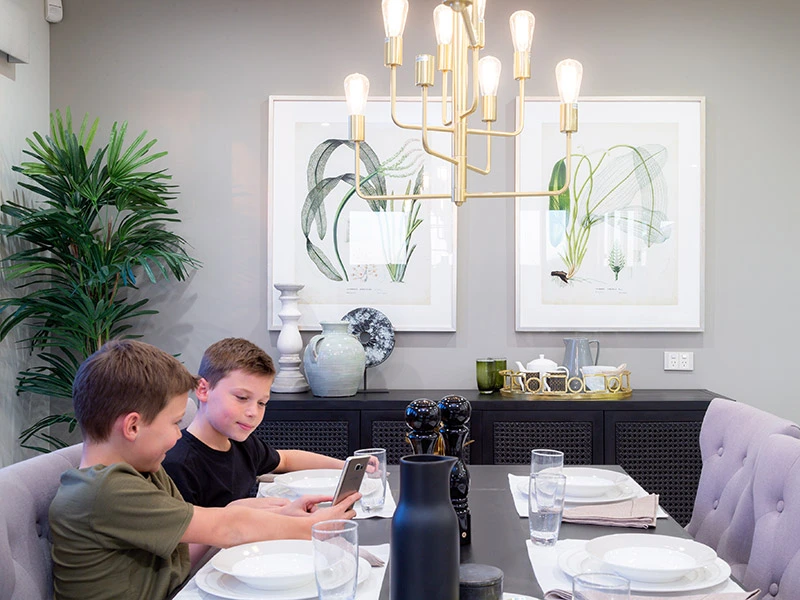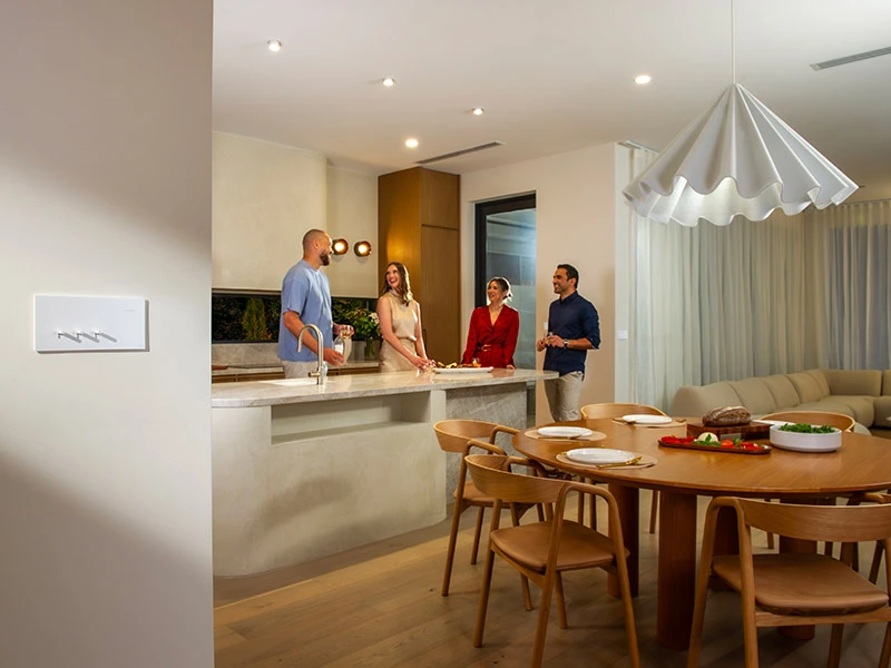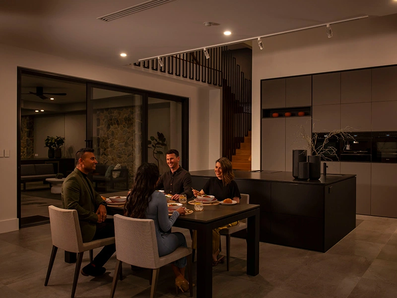 - Set the mood for every meal with adjustable lighting using Clipsal LED downlights controlled by a Wiser dimmer switch.